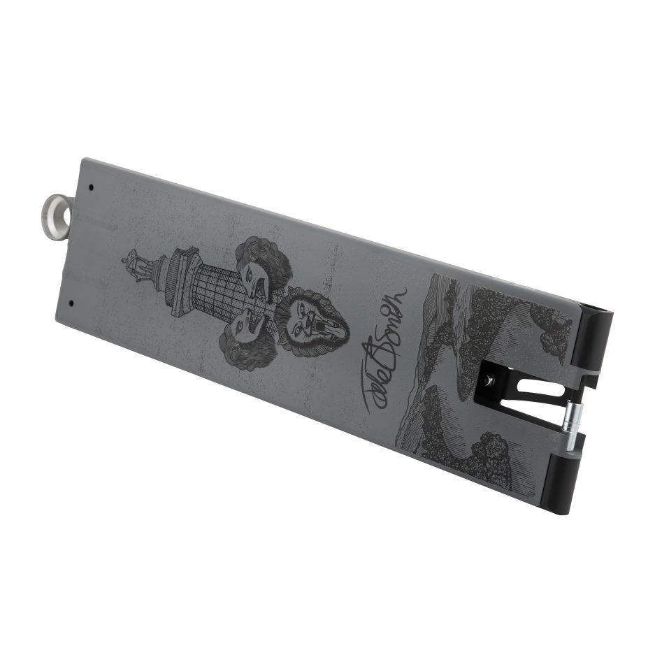 The deck has his signature graphic featuring elements from his home town of Shrewsbury, the graphic comes on a flat base base with a slight indent to ease board slides.