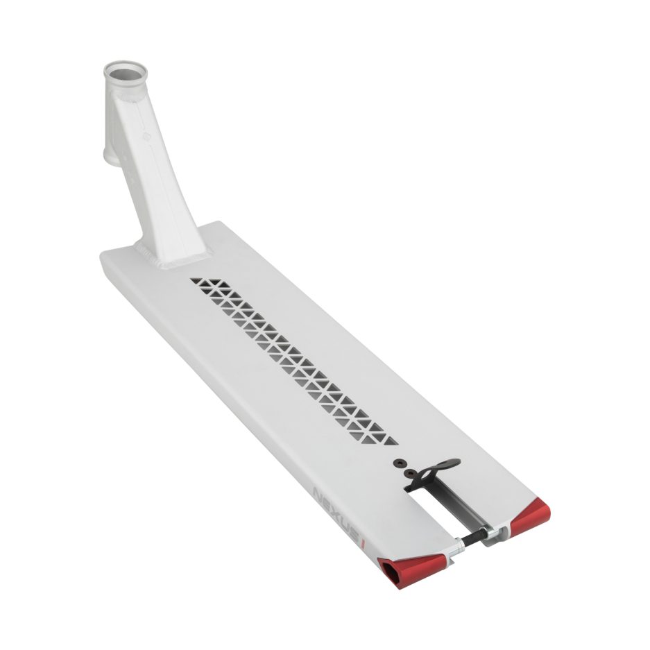The Extrusion will now be 6” and 6.5” with a perforated foot plate to reduce weight while also being easy to griptape over so that the rider is not limited by a large cut out through the top.
