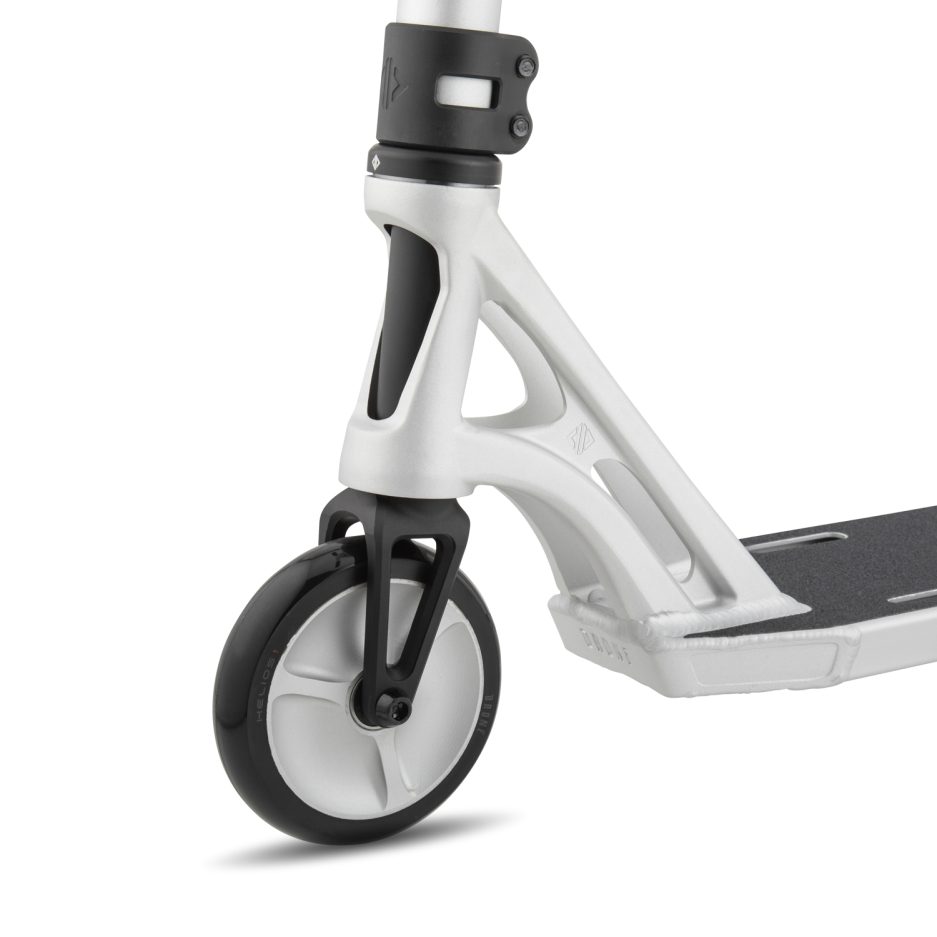 The deck itself weighs in at just 1.2kg, bringing the complete down to an astonishing 3.15 kilograms. The Shadow 3 is a true performance product, sporting the all-new Helios Hollow-Spoked Wheels. These wheels have an optimised core to PU ratio which reduces weight, increases rigidity and maximises power transfer for maximum speed. The wheels themselves rotate around our all new Ultra-Sonix bearings which boast unparalleled speed. The forks have been meticulously refined, cutting as much excess weight off them as possible to create a minimalist, lightweight design which improves the level of control and overall performance of the scooter. Aesthetically the deck now has top and bottom cut-outs that have been positioned to reduce weight even further without compromising the strength. The extrusion has been perfectly tapered to maximise foot space and reduce unnecessary weight.